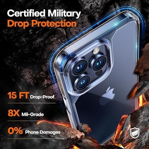 - 15FT Military-grade Protection TAURI for iPhone 15 Pro Case Clear is certified drop test, combines a soft-frame and hard PC back cover with 4 built-in corner Airbags to absorb impact, can prevent your phone from accidental drops, bumps and scratches.